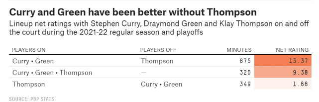在今年的常规赛+季后赛的时间段里,库里和格林在场上,克莱在场下一共875分钟,勇士百回合赢对手13.37分;库里、格林、克莱同时在场320分钟,勇士百回合赢对手9.38分;库里和格林在场下,克莱在场上的349分钟,勇士百回合赢对手1.66分。换言之,从整个赛季来看,三巨头同场的赢分效果,不如库里追梦在场,而克莱不在场的赢分效果。