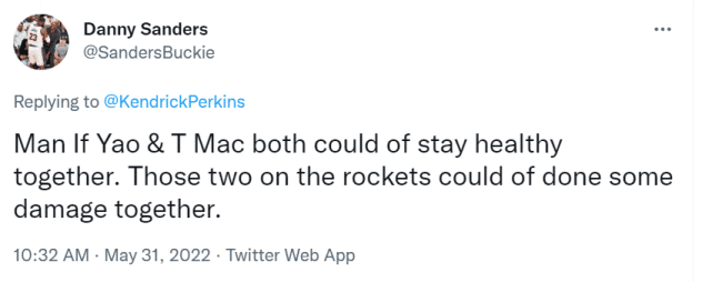 帕金斯回答勾起了一些球迷的回忆。一位球迷为姚麦感到遗憾,他写道:“如果姚明和T-Mac在一起时都能保持健康,他们俩在火箭能够制造一些伤害的。”