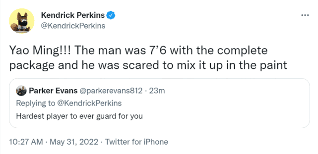 24直播网05月31日讯 ,名嘴肯德里克-帕金斯在社媒上与球迷们互动。一位球迷问他,谁是你防过最难防的球员,帕金斯的答案是姚明。“姚明!!!他身高7尺6,还带有全面的技能包,他在内线结合这些东西就太可怕了。”