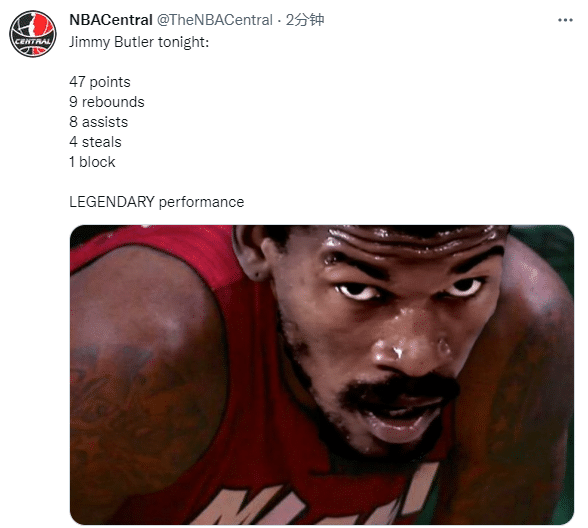 美媒晒神图,恶搞詹姆斯昔日的死亡之瞪神图,发推写道:巴特勒打出传奇级别的表现。
