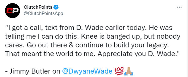 赛后巴特勒表示:我知道我们会赢下这场比赛,我们会赢下东决G7;巴特勒还透露今天早些时候,他接到了韦德的电话,韦德告诉他可以做到,膝盖受伤了,没人会在乎,上场,继续创造你的传奇;最后巴特勒感谢韦德,这应该就是巴特勒G5大爆发的原因。