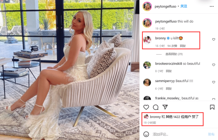 布朗尼的女友在社交媒体上晒出自己身穿性感礼服的美照,配文:这样穿就可以了;布朗尼在评论区留言:你太迷人(色眯眯的表情),并且第一时间点赞女友的动态。