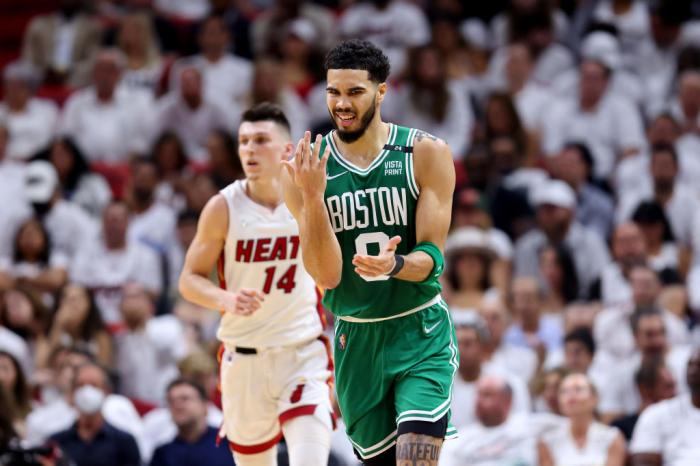 下半场,凯尔特人第三节突然哑火,长达7分钟没有运动战进球,被热火打出22-2的超级攻势,瞬间落后到12分,期间塔图姆连续两次失误,被巴特勒抢断反击得分;之后热火断电,绿军9-2反扑,塔图姆多次站上罚球线,期间他和塔克发生肢体接触,激烈卡位,裁判警告他们,以防事态恶化。