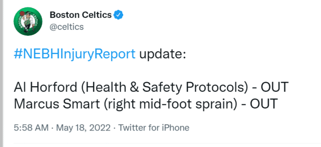 本赛季的季后赛至今,斯马特打了10场比赛,全部首发,场均贡献15分3.7篮板6.2助攻1.1抢断,他是年度最佳防守球员,攻防两端对球队都有很大的贡献。霍福德打了11场季后赛,也全部首发,场均贡献13分9.4篮板3.4助攻1.1抢断1.4盖帽。这位即将36岁的老探花,在季后赛里多次发挥关键作用,如今他也不能上场了。