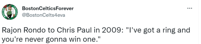 林书豪在社媒上写道:“”该死....我真希望保罗能在退役前夺得总冠军,他绝对值得拥有一座总冠军奖杯#传奇!”但保罗的冠军梦真的难圆了。这个赛季多好的机会,照样没有把握住。有球迷晒出了朗多2009年对保罗的那句无冠诅咒:“我已经拿到一个戒指了,但你永远不会拿到。”朗多的诅咒或许会成为现实。