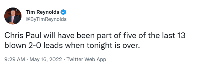 他在2008年、2013年、2016年和2021年都曾经在2-0领先的情况下被翻盘。在这次被翻盘前,太阳在去年总决赛2-0领先,结果连输4场,被雄鹿夺走冠军。另外,算上这场比赛,保罗抢七已经5连败了!