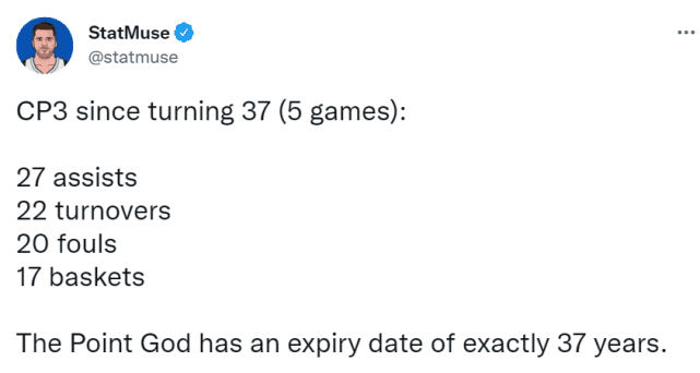 保罗的低迷,确实来得让人有些猝不及防,有球迷指出保罗可能是进入37岁后下降最快的球星了。这句话不无道理!这是保罗37岁生日后的第5场比赛,这5场比赛,保罗总计得到47分,场均不到10分,比起赛季平均水准下滑太多了!5场比赛,保罗累计27助攻,出现22失误,20次犯规,只进了17个球。