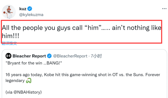 24直播网05月02日讯 16年前的今天,也就是2006年5月1日,湖人与太阳的季后赛首轮G4,科比常规时间最后时刻上篮实现绝平,紧接着在加时赛用一记压哨跳投绝杀对手。奇才球星库兹马今天在社媒上转发了科比双绝杀视频,并写道:那些所谓的“科比接班人”一点也不像。