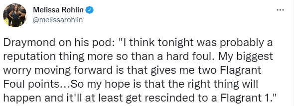 不久前,格林本人回应被驱逐,在节目中表示:我认为今晚可能是名声问题,而不是严重犯规。我最担心的是给我二级恶意犯规,所以我希望正确的事情会发生,至少应该被联盟降级为一级恶意犯规。