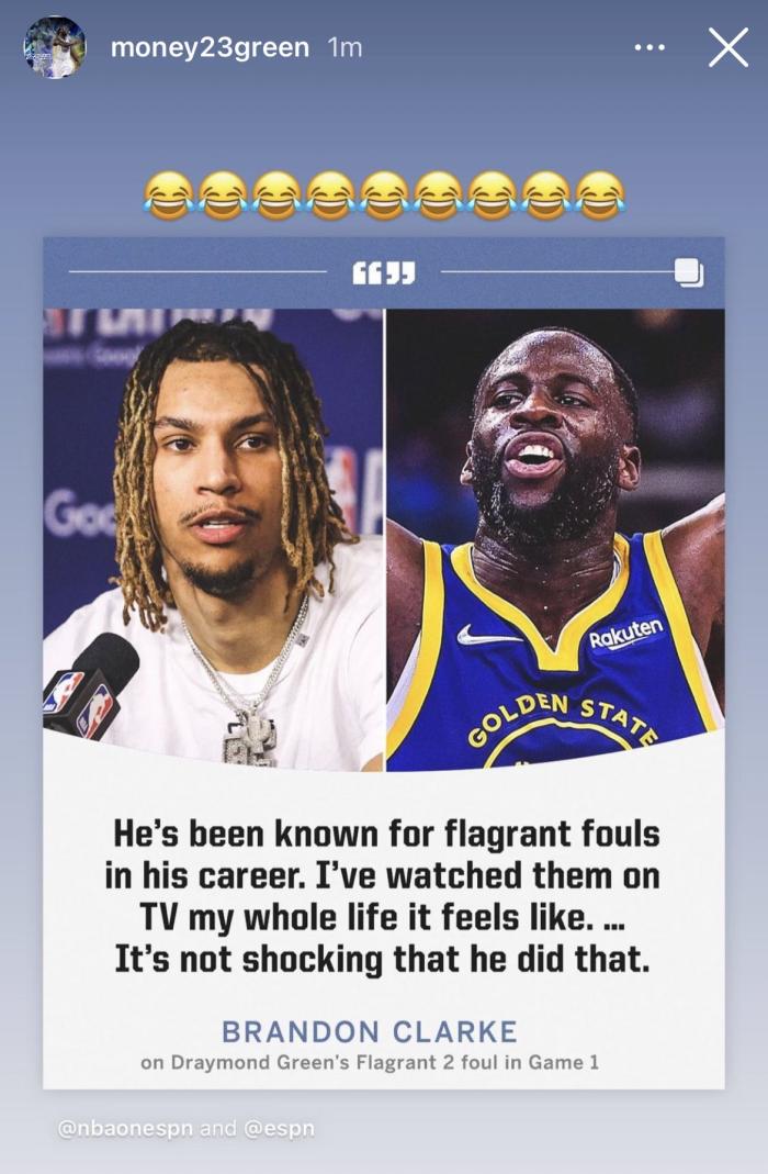 格林转发克拉克的赛后言论,并且配上9个笑哭的表情。