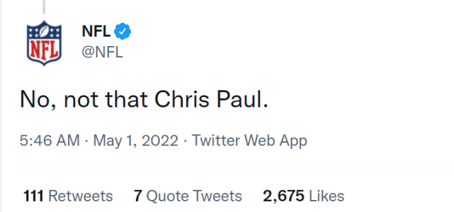 24直播网05月01日讯 ,2022年NFL选秀正式开启,华盛顿指挥官队在第7轮总第230位选中了克里斯-保罗,显然,这位NFL新人和太阳球星克里斯-保罗同名同姓。有趣的是NFL官媒还补充调侃道:“不,不是那个克里斯-保罗。”这一句引来不少球迷点赞,还有球迷表示看到这句调侃忍不住笑了。