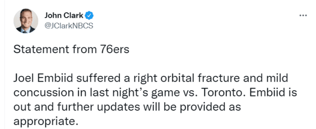 24直播网04月30日讯 ,76人官方宣布,全明星恩比德在昨天对猛龙的G6一战中右眼眶骨折和轻微脑震荡,他目前被列为“缺阵”的状态,名记查拉尼亚表示他暂无复出时间表。