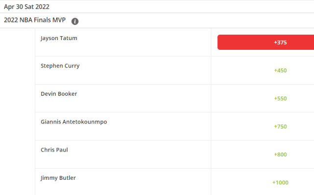 24直播网04月30日讯 ,晋级季后赛首轮的16支球队,已有7支正式出局,总冠军和总决赛MVP(FMVP)的赔率再次发生变化。总冠军的头号热门仍是勇士,但总决赛MVP的头号热门却不再是库里,凯尔特人的塔图姆超过了勇士的当家球星,独占榜首位置。