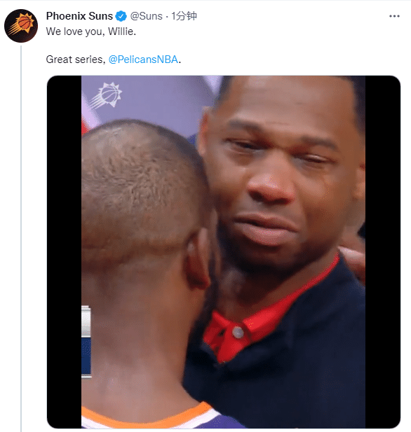 24直播网04月29日讯 ,鹈鹕G6主场惜败,系列赛大比分2-4被太阳淘汰出局,鹈鹕出局后,威利-格林情绪激动,拥抱保罗时泪流满面,鹈鹕主帅哭泣的画面太感人;赛后太阳官方晒出这一幕,发推写道:我们都爱你,威利,伟大的系列赛。