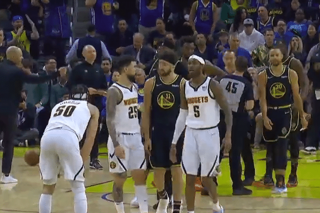 德雷蒙德-格林劈扣得分,约基奇抛投回应,库里三分命中,约基奇抛投再中,克莱造犯规两罚全中,卢尼顺下上篮得分,克莱抢断,维金斯反击一条龙上篮得分并且造成了犯规,勇士取得5分的领先,戈登进攻犯规撞倒了格林,随后两人发生小冲突,裁判吹罚戈登技术犯规,勇士连续进攻不,戈登上篮打中并且造成犯规,普尔超远三分命中,莫里斯三分回应,库里上篮得分,里弗斯身体不适反回更衣室。
