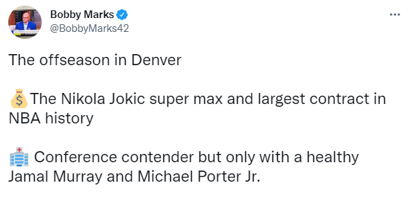ESPN薪资专家Bobby Marksb表示,约基奇可以在今年休赛期,和掘金签下一份历史最大的5年价值2.54亿美元的超级顶薪合同。