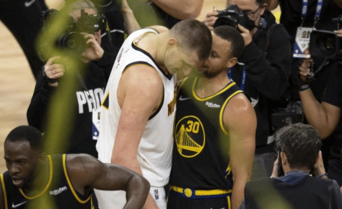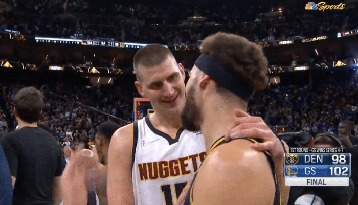 赛后两队球员相互致意,约基奇拥抱紧紧拥抱格林、库里和汤普森,和水花兄弟寒暄时有说有笑;本轮系列赛,约基奇尽力了,虽败犹荣,他可以昂首离开;值得一提的是,G5生死战,考辛斯表现出众,替补12中8轰下19分4篮板,希望今夏能再签一份合同。