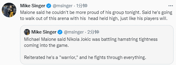 掘金主帅马龙则透露约基奇腿筋紧张,过去几场比赛一直带伤出战,直呼约基奇是一名战士,为全队的表现感到自豪。