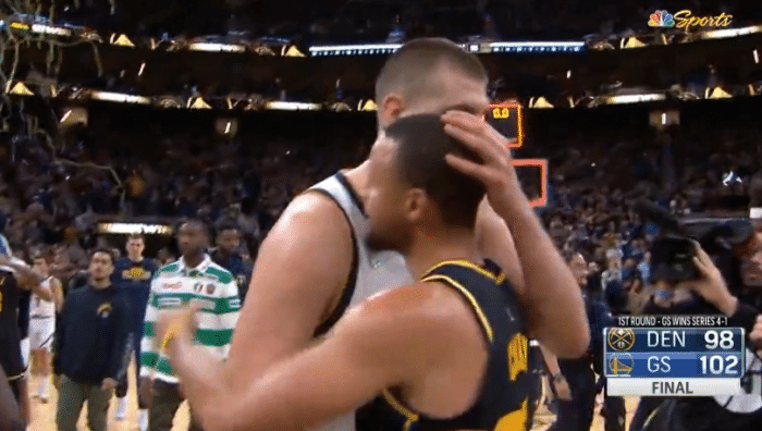 24直播网04月28日讯,勇士主场拿下系列赛第五场,总比分4-1淘汰掘金从而杀进西部半决赛;库里全场轰下30分5篮板5助攻,下半场独砍20分以及末节关键时刻接管比赛;约基奇狂砍30分19篮板8助攻拼尽全力仍遗憾出局,赛后约基奇拥抱勇士众球星,满脸笑容表达敬意。