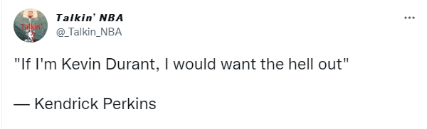 帕金斯还说:最好不要小看杜兰特,你想知道为什么吗?因为有个人,他把一切都奉献给了这支球队,他就是杜兰特,没有别人。
