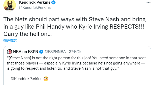 帕金斯还发推写道:篮网应该与纳什分道扬镳,并引进像菲尔-汉迪这样的让凯里-欧文尊敬的人。