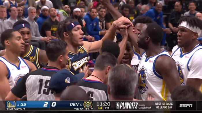 24直播网04月25日讯 ,NBA季后赛勇士和掘金系列赛G4正式开打,开场仅打40秒,场上发生冲突事件,格林戳到约基奇的眼睛引冲突,戈登和格林发生肢体接触,被拉开后隔空互喷,两人都吃到技术犯规。