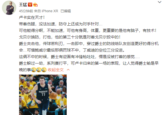 知名篮球人王猛表示:卢卡实在天才!带着伤腿,没法加速,防守上还成为对手针对…可他能得分啊,不能加速,可他有身高,体重,更重要的是他有脑子,有技术!戈贝尔换防,打他,他的第三十分就是对着戈贝尔投中的!爵士夹击他,传球若利刃,一击即中,穿过爵士的防线给队友创造更好的得分机会…可惜鲍威尔最后那俩罚球不中,丁威迪的空位三分没进。