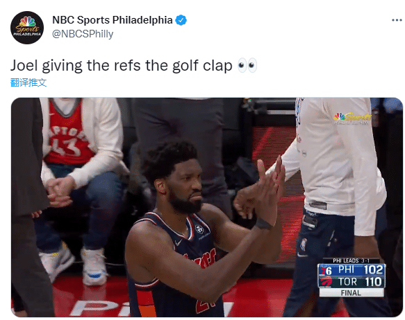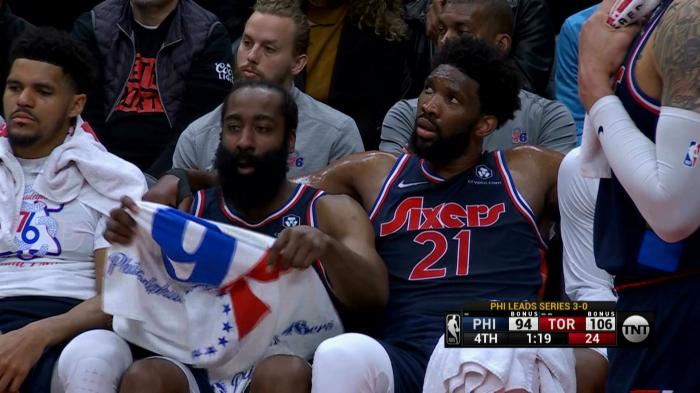 恩比德坐在替补席搂着哈登,两人都是一脸失落和沮丧;G3赢球赛后,恩比德豪言要横扫猛龙,如今横扫已成泡影,不过G5将重回费城,他们有望在第五场拿下系列赛。