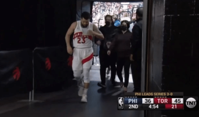 第二节4分50多秒,范弗利特遭遇臀部伤势,对此他十分沮丧,撕烂球衣宣泄内心的怒火,之后范乔丹穿着撕烂的球衣返回更衣室,并因伤提前退出比赛;范乔丹伤退,西亚卡姆轰下34分8篮板5助攻,特伦特24分,助猛龙拿下G4,从而拒绝被横扫出局。