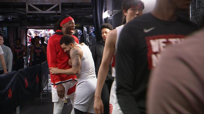 猛龙赢球赛后,范乔丹在球员通道中趴在队友怀抱中庆祝胜利,满脸笑容太开心。