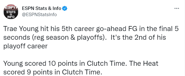 4.特雷-杨职业生涯第5次在最后5秒打进准绝杀,季后赛生涯第2次