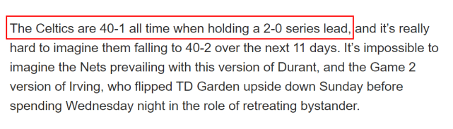 24直播网04月22日讯 ,凯尔特人114-107击败篮网,总比分2-0领先。绿军队史上取得过41次系列赛2-0领先,而他们最终40次胜出,只有1次被逆转。《纽约邮报》写道:“很难想象在未来11天,这个成绩会变成40胜2负。很难想象这个版本的杜兰特和G2版本的欧文能率队获胜。”显然,这家纽约媒体看衰篮网的前景。