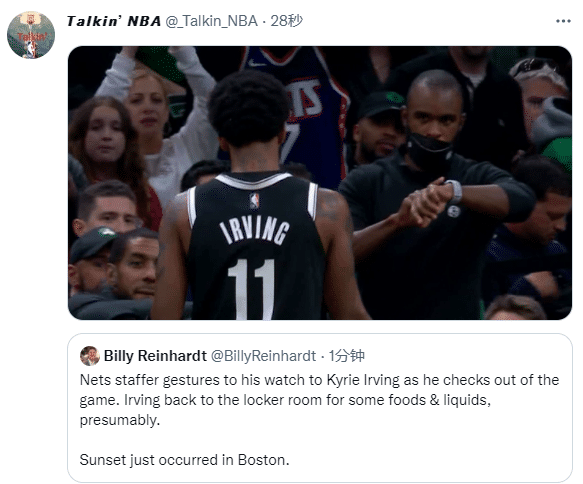第一节3分多钟,欧文被换下场,并且径直走回归更衣室,为何欧文突然离场?篮网跟队记者Billy Reinhardt发推写道:当凯里-欧文下场时,篮网队的助教指着他的手表给欧文提示时间,欧文应该是回到更衣室去吃点食物和喝点东西,日落刚刚出现在波士顿。
