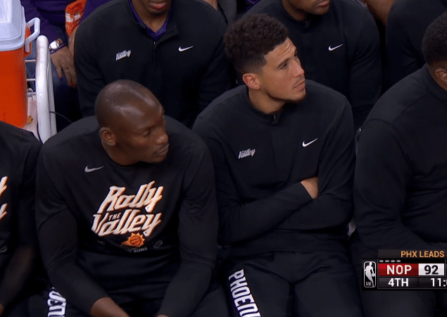 首节比赛,布克开场连得5分,克劳德2+1,太阳8-2领先,英格拉姆和CJ带队反扑并且反超比分,见状布克再次砍分,外线接连命中3记三分,更是投进不讲理压哨中投,翻身后仰太潇洒,第一节打满12分钟轰下16分,和小宝宝击拳一幕太暖心。
