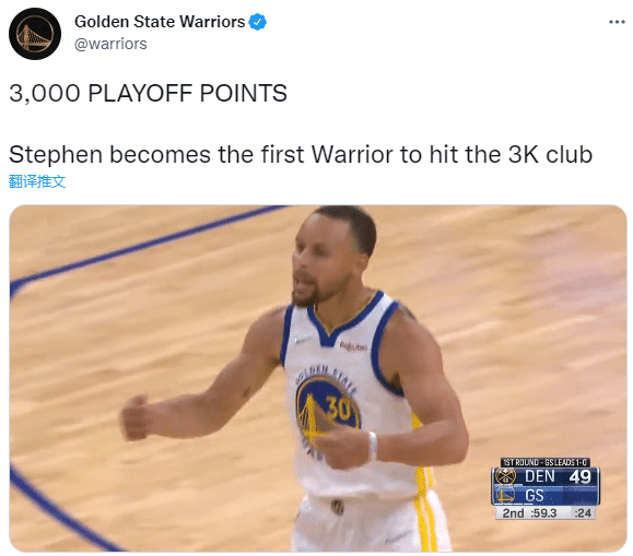 勇士上半场57-51领先掘金6分,库里半场替补拿到16分,季后赛生涯总得分正式达到3000分,从而迎来里程碑时刻;库里成为勇士队史第一位季后赛3000分先生,也成为NBA历史第27位季后赛得分突破3000分的球员,成为詹姆斯、杜兰特、哈登之后现役第4位达成如此成就的球员。