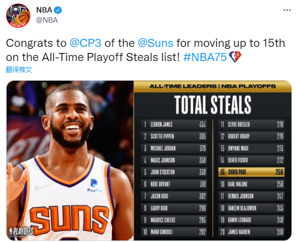 保罗带队拿到季后赛开门红还破纪录,季后赛抢断数超越卡尔-马龙升到历史第15位。