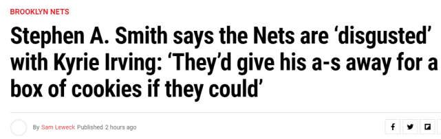 北京时间10月13日,篮网官方宣布,欧文不会随队训练或参加比赛,直到履行纽约的防疫规定。欧文将损失主场部分的1700万美元薪水,篮网将支付他客场的薪水,以避免欧文向球员工会投诉。被称为“美国杨毅”的名嘴斯蒂芬-A-史密斯在一档节目中吐槽欧文,放言现在只要一盒饼干,就能说服篮网让欧文离开。