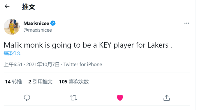 从热火时期开始,詹姆斯就非常喜爱和射手一起上场,这样方便他突破篮下,即便遭遇包夹,也能及时找到埋伏在外线的射手。这两场季前赛下来,相信蒙克不进获得了主帅沃格尔的信任,在场边观战的詹姆斯应该也是看在眼里。上个赛季,蒙克就在常规赛就投出了40%的三分命中率,如果他能在湖人延续这样的效率,或许能成为詹姆斯外线最佳新拍档,拭目以待!