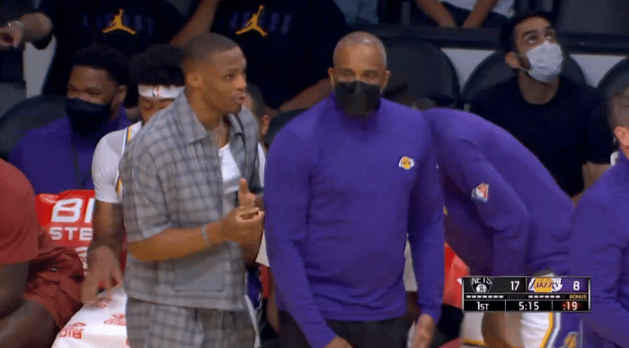 24直播网10月04日讯 NBA季前赛揭幕战正式打响,湖人主场97-123不敌篮网,詹姆斯、威少、杜兰特、哈登和欧文等球星都是高挂免战牌,他们都是身穿便装坐在场边观战;比赛期间,湖人场边暖心一幕曝光,威少主动为浓眉让座,然后詹眉并肩坐在一起。