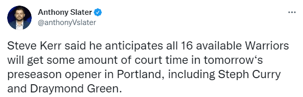 24直播网10月04日讯 ,NBA季前赛已经正式打响,勇士众将都能上场参加比赛,据勇士记者Anthony Slater报道,科尔表示,预计所有16名可用的勇士球员都将在明天对阵波特兰开拓者的季前赛揭幕战中获得一定的上场时间,包括斯蒂芬-库里和德雷蒙德-格林。