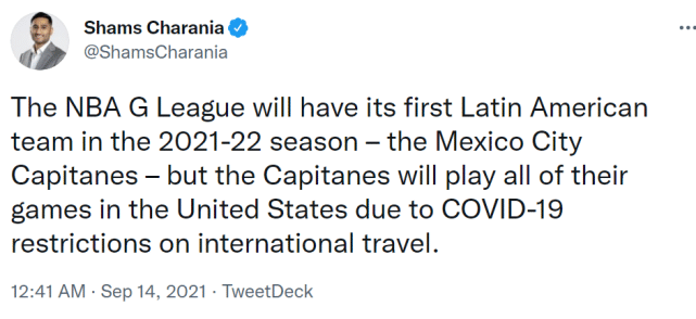 24直播网9月14日讯,据名记查拉尼亚报道,NBA发展联盟(G联赛)将在下赛季迎来第一支拉丁美洲的球队——墨西哥城卡皮坦内斯(Mexico City Capitanes)。由于疫情防控的原因,卡皮坦内斯队下赛季的比赛将都会在美国境内进行。
