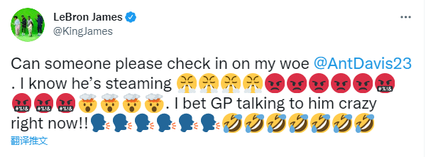 浓眉支持的包装工队3-38惨败新奥尔良圣徒队,詹姆斯第一时间发推:有人能查看一下我哥们安东尼-戴维斯 吗?我知道他气炸了(一系列生气的表情),我打赌全科医生目前正在跟他谈话(6个大喊和7个哭笑不得的表情)!