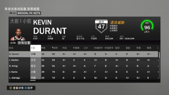 三巨头的能力值分别为KD96、哈登94、欧文91,但是这支球队没有人在80-90能力值之间,再往下就是哈里斯阿德的79,格里芬和米尔萨普的78!新赛季被认为是篮网和湖人的争霸战,媒体各种炒作两队会师总决赛,如果真是那样的话,话题度一定拉满,收视率饱满,三巨头PK三巨头太有意思了!