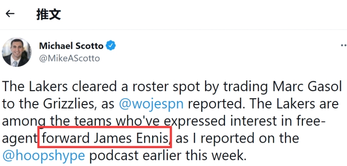 送走小加后,湖人拥有保障合同的球员减至13人,紫金军团还拥有两个签约名额。根据名记Michael Scotto的报道,湖人有意签下前锋詹姆斯恩尼斯,这名悍将最近这段时间一直跟湖人有牵连,昨天还在湖人ins中发表评论,看上去他迫不及待想要加盟。