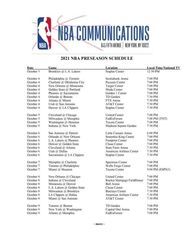 24直播网9月11日讯 ,NBA官方公布了2021-22赛季的季前赛赛程。季前赛将于10月4日(北京时间,下同)开打,一直持续到10月16日,前后共13天66场比赛。