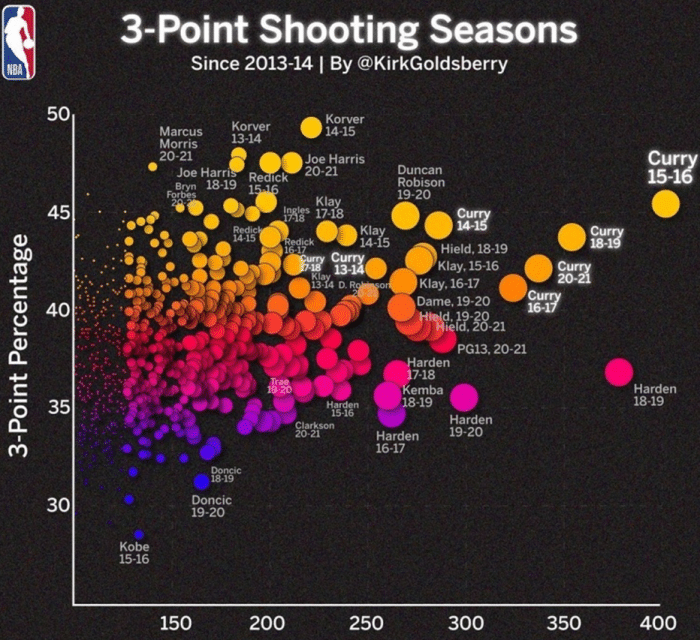 除了库里之外没有人可以满足这两点要求,而库里令人震撼的一点在于,这名勇士王牌不仅一次达成这一成就。登陆NBA联盟至今,库里先后四次能够达到这一成就。开始于15-16赛季,20-21赛季则是以42.1%的命中率投进337个。其他射手,要么就是单赛季命中数没有超过300个,要么就是数量超过了但命中率却低于40%!