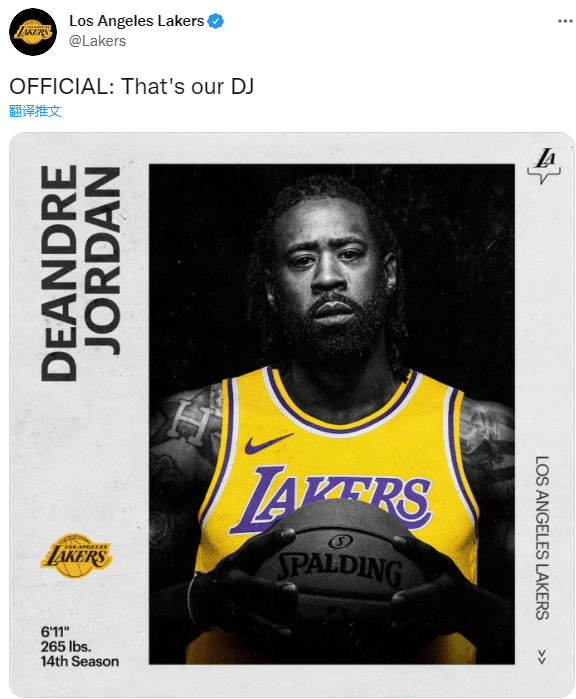 24直播网9月10日讯 ,篮网旧将小乔丹正式签约湖人,洛杉矶湖人已经官宣引援这位全明星中锋,晒照并配文:这是我们的DJ(小乔丹名字的缩写);此前小乔丹被篮网交易离队,和活塞达成买断后加盟湖人,新赛季他将辅佐湖人三巨头冲击总冠军。