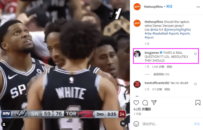24直播网9月06日讯 近日,美媒体thehoopfilms晒出德罗赞身披马刺球衣隔扣猛龙球员的精彩一幕,配文发问:猛龙应该退役德罗赞的球衣吗?对此,湖人巨星勒布朗-詹姆斯回应:这能算个真正的问题吗?哈哈哈,他们当然应该(退役德罗赞的球衣)。
