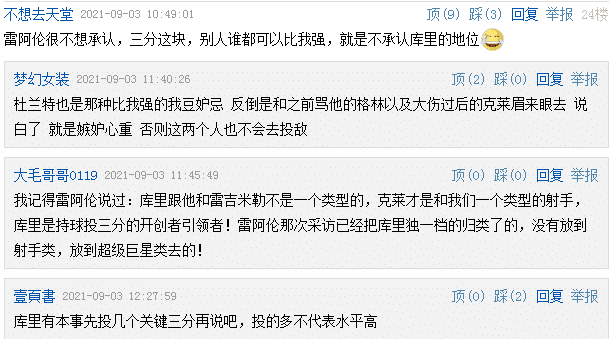 显然,雷阿伦在三分球射手的评价上,从未把库里放在射手的位置上,网友直言雷阿伦是把库里放到超级巨星的位置上。其实米勒同样是一个超级巨星,这与是否拥有总冠军无关,与库里的打法不一样,米勒的打法和汤神更为相似,进攻端更多以无球跑位完成三分球出手,防守端同样压迫对手,可以说库里和米勒不是一个类型的射手,不过库里加盟历史三双王没有悬念。