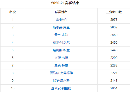 2020-21赛季结束之后库里累计命中2832记三分球,距离雷阿伦历史第一的三分球命中数2973记,只剩下141记三分球。上赛季库里场均命中5.3记三分球,累计打了62场比赛,也就是说库里在缩水赛季仍能命中333记三分球,新赛季是82场比赛,库里出战60场以上没有一点问题,可见库里超越雷阿伦成为历史三双王没有悬念,成为NBA历史第一个打破生涯命中3000记三分球的球员都没有问题。